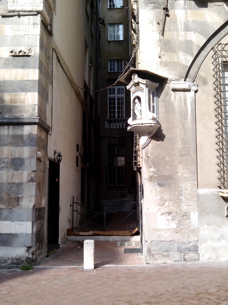 En Génova nos muy usuales las Edicolas, figuras de santos encastadas en la piedra, y especialmente en las esquinas. En un principio se pensaron para proteger la casa o edificación por parte del Santo venerado. Pero tenían una parte práctica: por las noches sólo las edícolas estaban iluminadas con velas o luces, y antes que vinieran los faroles a iluminar las calles eran utilizadas para poderse mover por las angostas calles de Génova o incluso para orientarse.