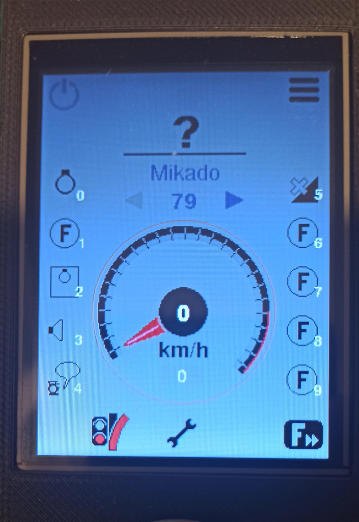 | A la izquierda la locomotora está diseñada por el firmware y es en blanco y negro. En la derecha la locomotora, por lo que el firmware lo toma de ahí y se pueden ver los detalles en color. En los dos casos, los iconos sin iguales y si la función está habilitada, se ilumina con fondo amarillo para saber que está activada. |
