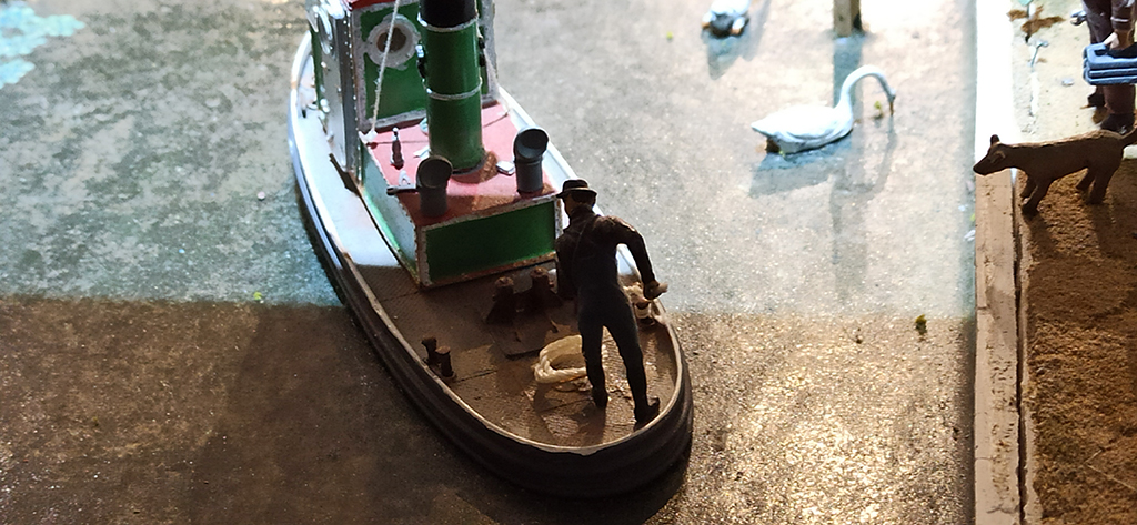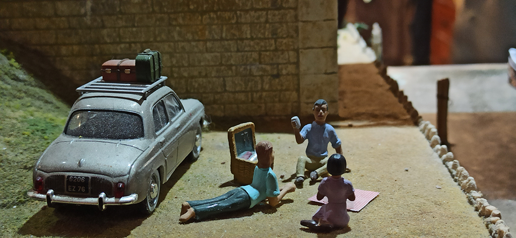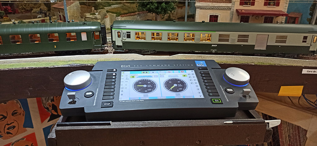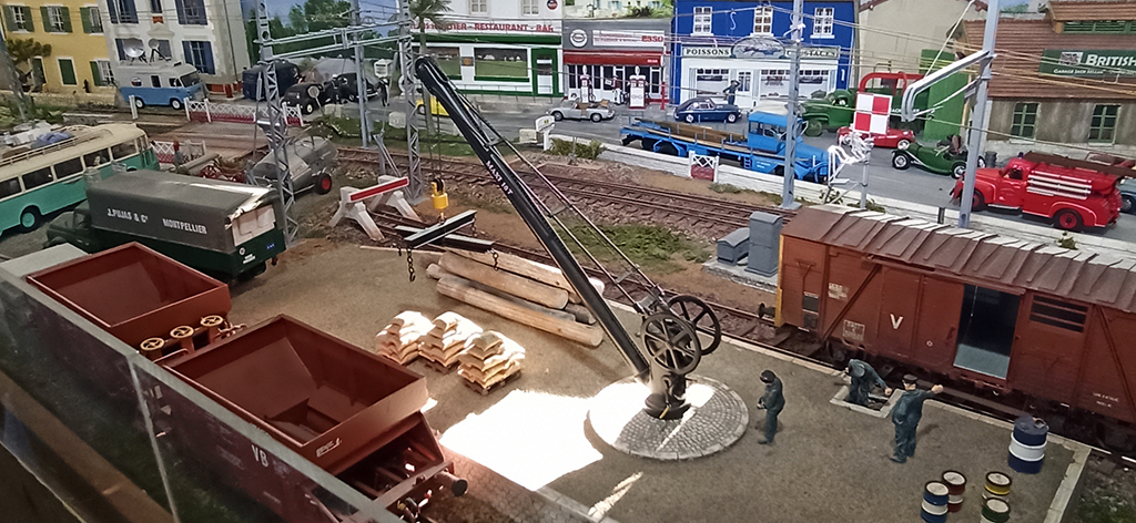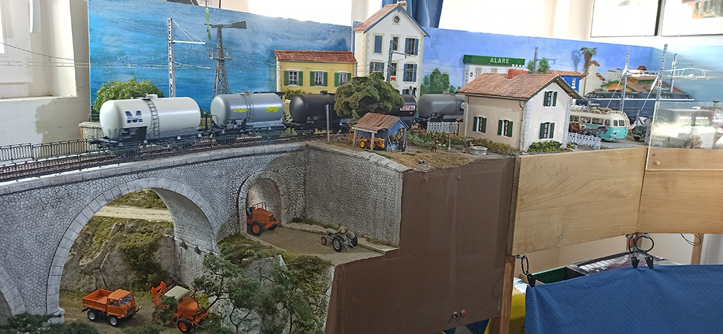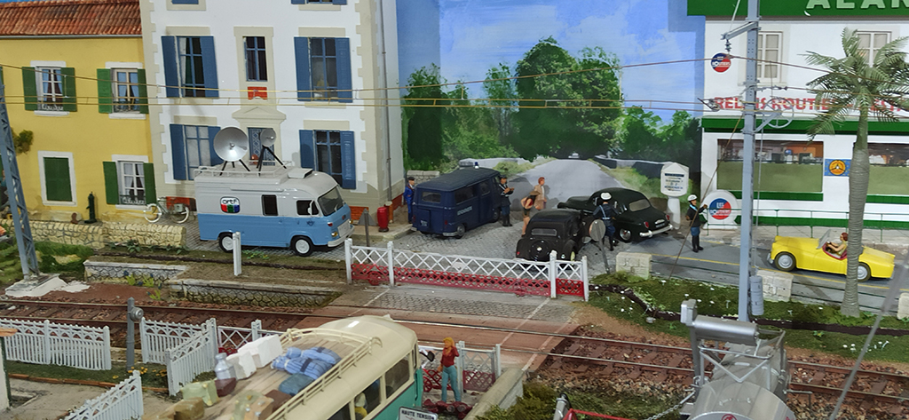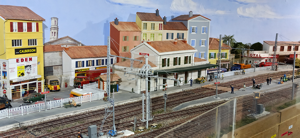 | Sita en los bajos de una casa del extrarradio de Nîmes, la maqueta de 0 convence por su contenido artístico más que por su cantidad de vía o material (casi todo expuesto en vitrinas). Michel Louette, que otrora fuera un deportista del atletismo, guardó desde su más tierna infancia un grato recuerdo de la línea del Médoc de su Gironda natal. Ha tenido desde pequeño un Hornby de 3 raíles, maquetas en escalas N y H0, y por último la actual en escala 0 (1/43). A partir de la campra de una 7100 de Lemaco, articuló un circuito de vía única, vendió todo el material de H0 y compró el mismo pero en la escala superior. Para el año 2009 comenzó a realizar el circuito y sobre el año 2016 o termina. El decorado se basa en las regiones del sudeste y sudoeste francés, sin evocar un lugar preciso. La estación de Pauillac, que no se parece en nada a la real, es una sola indicación de su lugar de nacimiento. Ha construido muchos decorados y utilizado especialmente muchos de Daniel Coutier de Architecture de France, y las locomotoras artesanales en latón que le ha montado Thierry Magrou (BB4600 y 4700), antiguas locomotoras de MIDI muy parecidas a nuestras 1000 españolas que rodaban bajo catenaria de 1500 voltios. Para la explotación del circuito ha preferido hacerlo en digital desde el principio para simplificar y tiene una central ECoS que es el cerebro y tres formas de alimentación. A mí lo que más me ha impresionado es el collage de fotos y pintura sobre el fondo del decorado y la colocación estratégica de las fotos y/o edificaciones para dar una sensación de 3D y dar más amplitud de la que goza la maqueta. Por contra decir que los trenes tienen que ser reducidos debido a las restricciones de la maqueta, pero que no desentonan debido a la ambientación en una época pasada (III/IV). La catenaria, bastante inusual, ha sido objeto de atención por parte de Michel, que reconoce que por estar en precario, muchas veces se lleva golpes y daños no intencionados que le hacen repararla cada dos por tres. Michel es un habitual de los kits y nos enseñó in-situ la gran cantidad de ellos que posee aún sin montar y la gran calidad de los mismos. Como no podía ser menos, en esta escala los puristas prefieren ya el enganche de husillo (parecido al real) en vez de utilizar enganche automático del tipo Lenz. Normalmente en el hotel Vatel se reúnen los "relativamente pocos" modelistas franceses de escala 0 que vienen de toda Francia a ponerse al día sobre técnicas, kits y técnica, al menos 4 veces al año, y al menos una vez por año se realiza una asamblea de constructores con Henri Rode, propietario de AMJL y ya van por 63 personas y esperan llegar a 70 u 80. Esta reunión de constructores se celebra desde hace ya 20 años. Algo que lo hace una persona excepcional es que cualquier amigo de la escala 0 es bienvenido y puede hacer correr sus modelos en la maqueta de Michel. Como colofón a esto, me llevé un tractor Berliet a escala 0 que dispusieron para su compra y que nos hizo ilusión para su exposición de la marca Chrezo. |