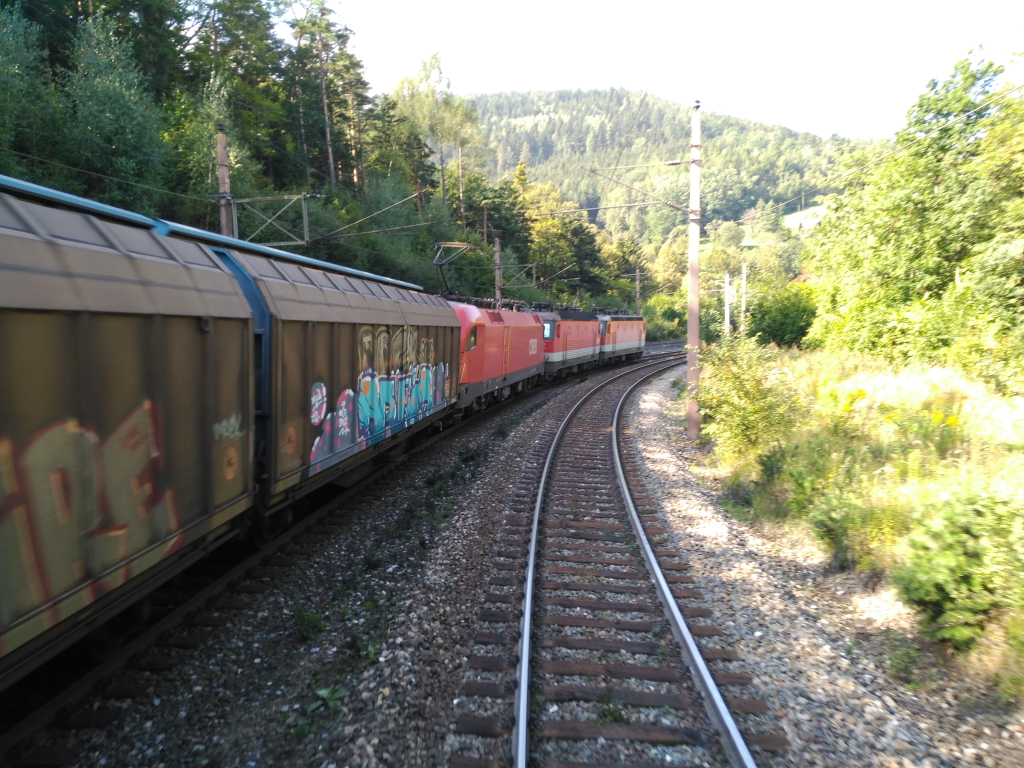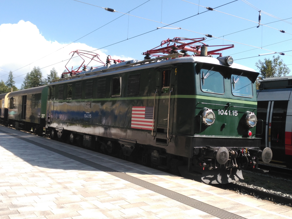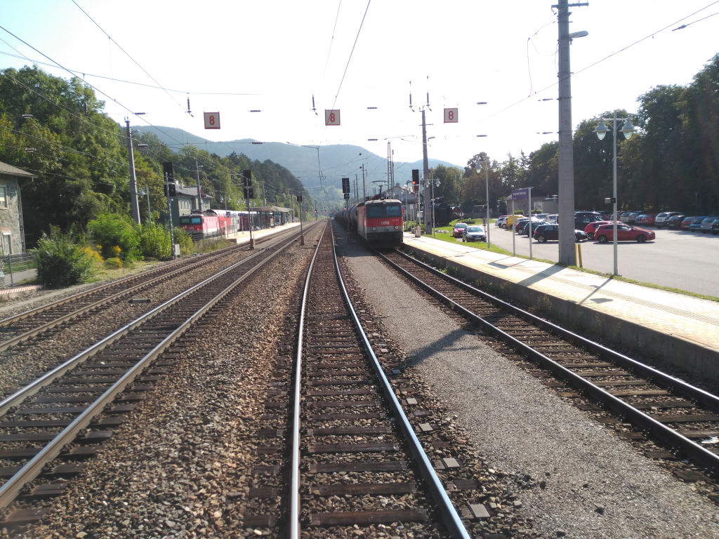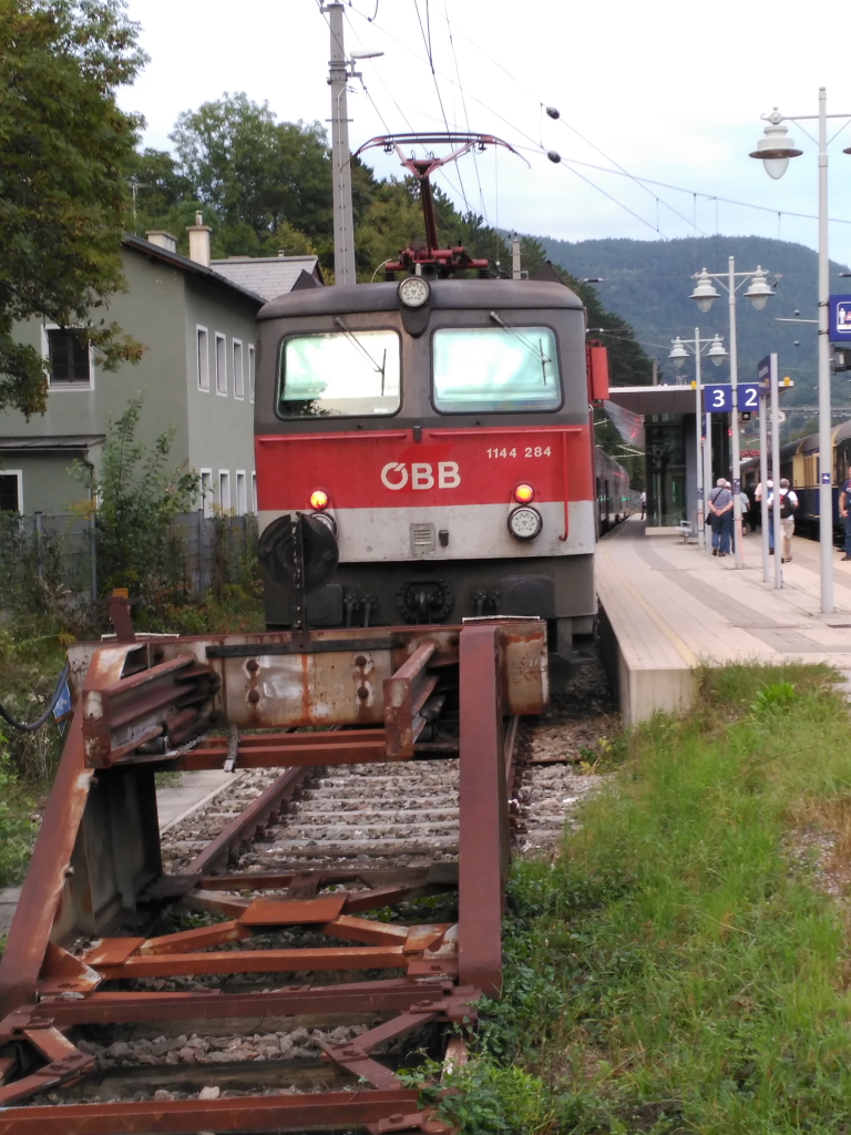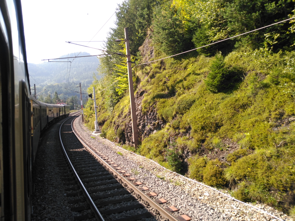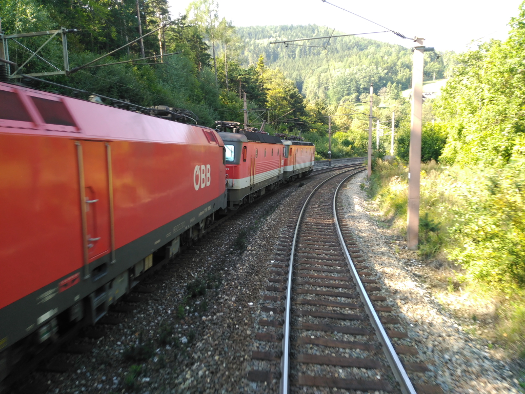 En una de estas locomotoras, con la librea antigua y la bandera de la ayuda americana en uno de sus costados y vagones de dos ejes, recorrimos en un viaje integrado en la malla de la línea. Por tal motivo pudimos comprobar el paso de todo tipo de ferrocarriles por la línea del Semmering. A veces nos teniamos de esperar, o cambiar de vía funcionando en modo banalizado.