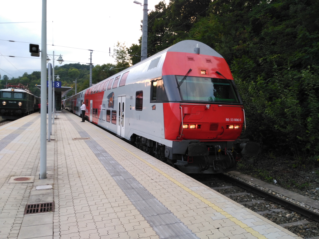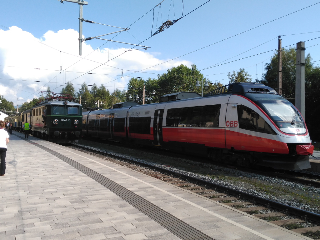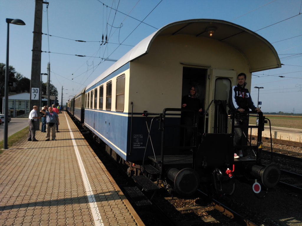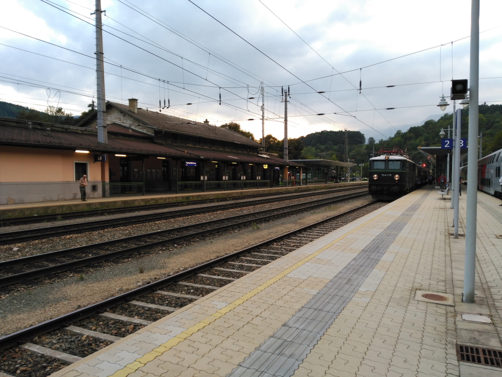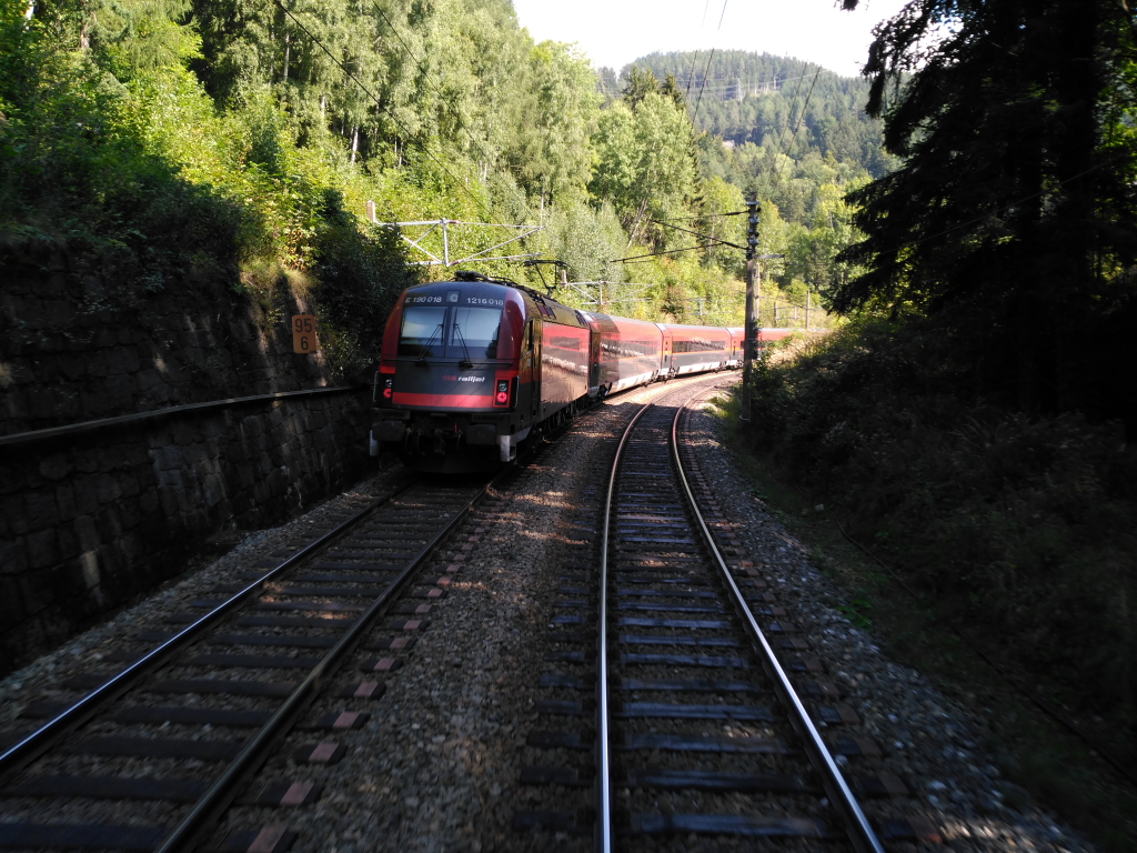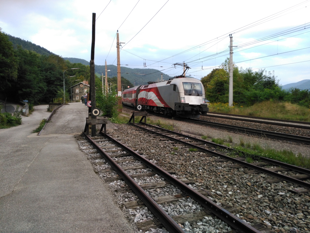 En una de estas locomotoras, con la librea antigua y la bandera de la ayuda americana en uno de sus costados y vagones de dos ejes, recorrimos en un viaje integrado en la malla de la línea. Por tal motivo pudimos comprobar el paso de todo tipo de ferrocarriles por la línea del Semmering. A veces nos teniamos de esperar, o cambiar de vía funcionando en modo banalizado.