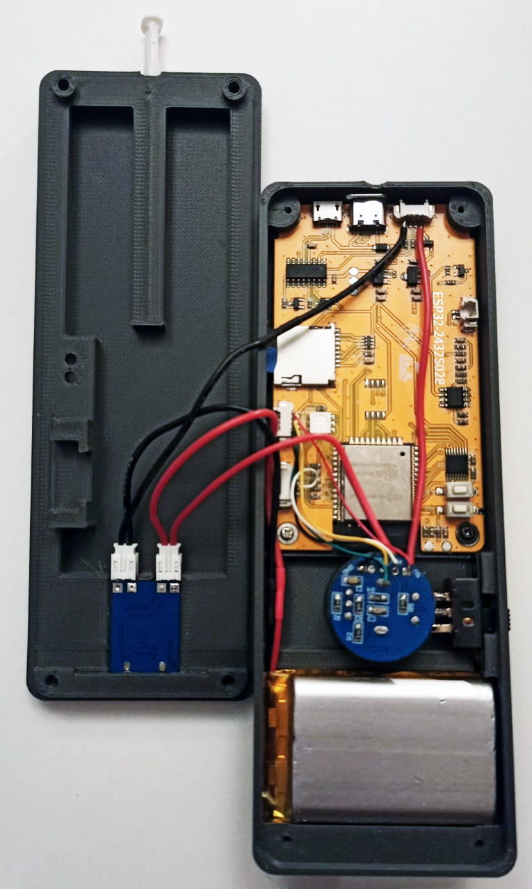 ![]() | En la placa base de la ESP32 se deben soldar dos cables de alimentación a la parte superior de la placa, como se puede ver en la foto de la izquierda. El cable del positivo tiene que pasar por el interruptor o conmutador para que realice su función de encendido y apagado del mando inalámbrico. Posteriormente se deben soldar los cables del encoder en dos de los conectores de salida/entrada como se puede ver en la imagen (1 solo cable en el conector P3 y los otros cuatro en el conector I/O. Cortar los cables a la medida correcta para poder conectar holgadamente a los componentes (placa de alimentación, interruptor y encoder). En la foto podemos ver que en vez de optar por soldar los cables a la placa de alimentación, y dado que está situada en la tapa, he crimpado dos conectores JST aéreos para los cables procedentes de la batería y del interruptor/placa ESP, los machos están soldados o bases a la placa 4056.