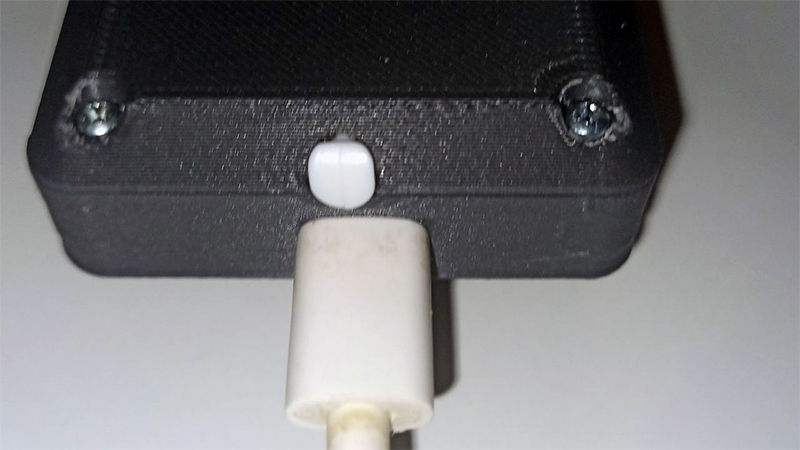 ![]() | En uno de los extremos, y centrado sobre la pared del mando se encuentra un conector USB- que está solidario con la placa ESP32 y sirve en este caso sólo para grabar el firmware. En la foto se puede apreciar el cable USB conectado. Además sobre el mismo, e insertado en su cubículo de la tapa se encuentra el lápiz puntero, necesario en caso de precisión. |
