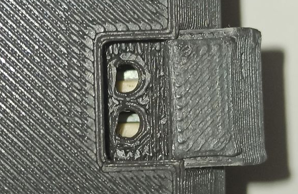 ![]() | En la tapa inferior, y en uno de los costados se encuentra una pequeña trampilla deslizante que oculta para protección los agujeros de acceso a los pulsadores del RESET y el BOOT sitos en la placa ESP32 por la parte trasera. |