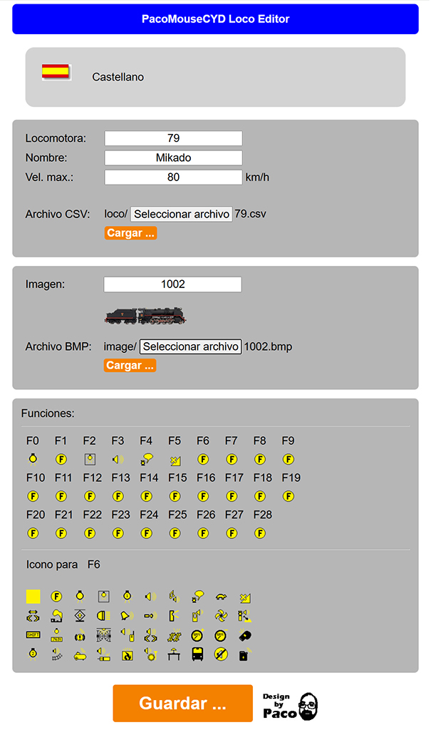 El editor de locomotoras para el mando PacoMouse CYD es una herramienta adicional que está ubicada en la carpeta doc del archivo comprimido que suministra Paco Cañada. Es una página html que funciona a modo de editor y que edita la información básica de la locomotora, su imagen y los iconos de funciones que estarán visibles en el PacoMouse CYD.